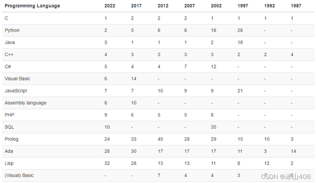 以下是十大编程语言的历史排名(取12个月内位置的平均值):