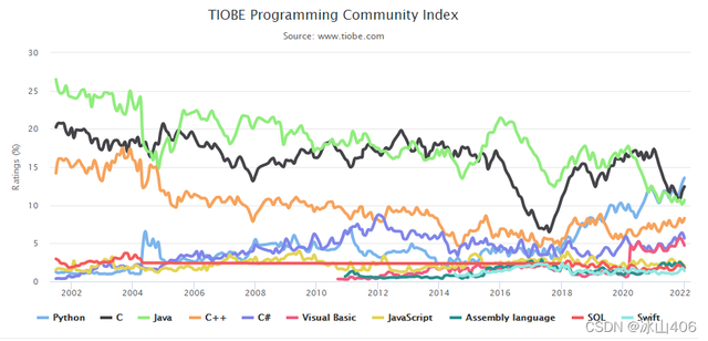 Top 10语言TIOBE编程社区指数走势(2002-2022):