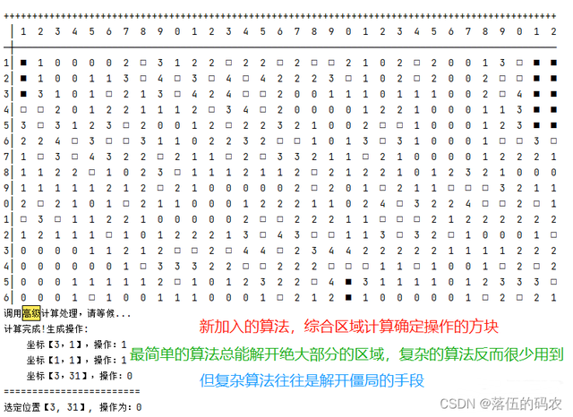 八个格子遍历完成后,若 z 等于 0, 则说明coordinate_list串列中记录的’■‘格子都是安全的,可以点击,于是将coordinate_list串列中的每个坐标后记录可以点击(即操作1),回传,